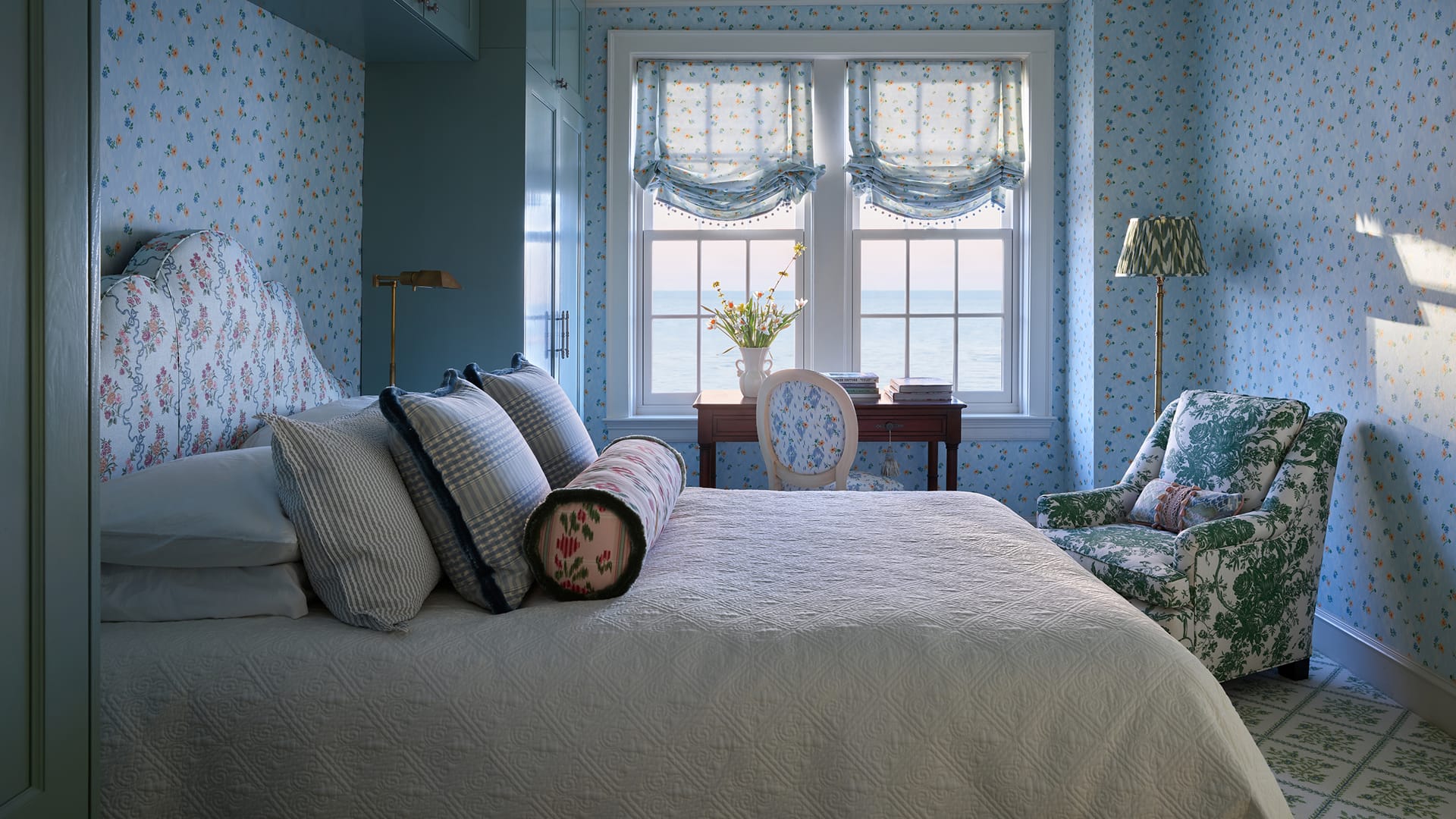 Blumenmotive mit Schleifen, strukturierte Spaliermuster, malerische Pflanzenmotive und durchdachte Streifen entfalten sich vor einer Farbpalette aus sonnenverwöhnten blues, blush, sage und Buttergelb. Jedes Muster wurde entworfen, um einem space Rhythmus und Klarheit zu verleihen und dabei Dekoration und Strenge in Einklang zu bringen.