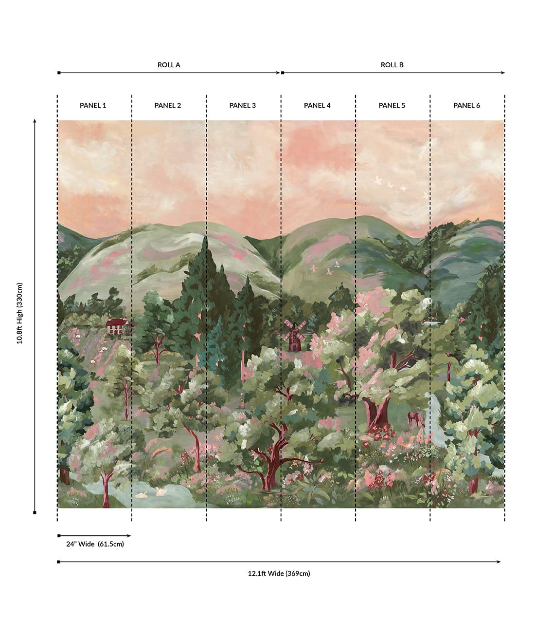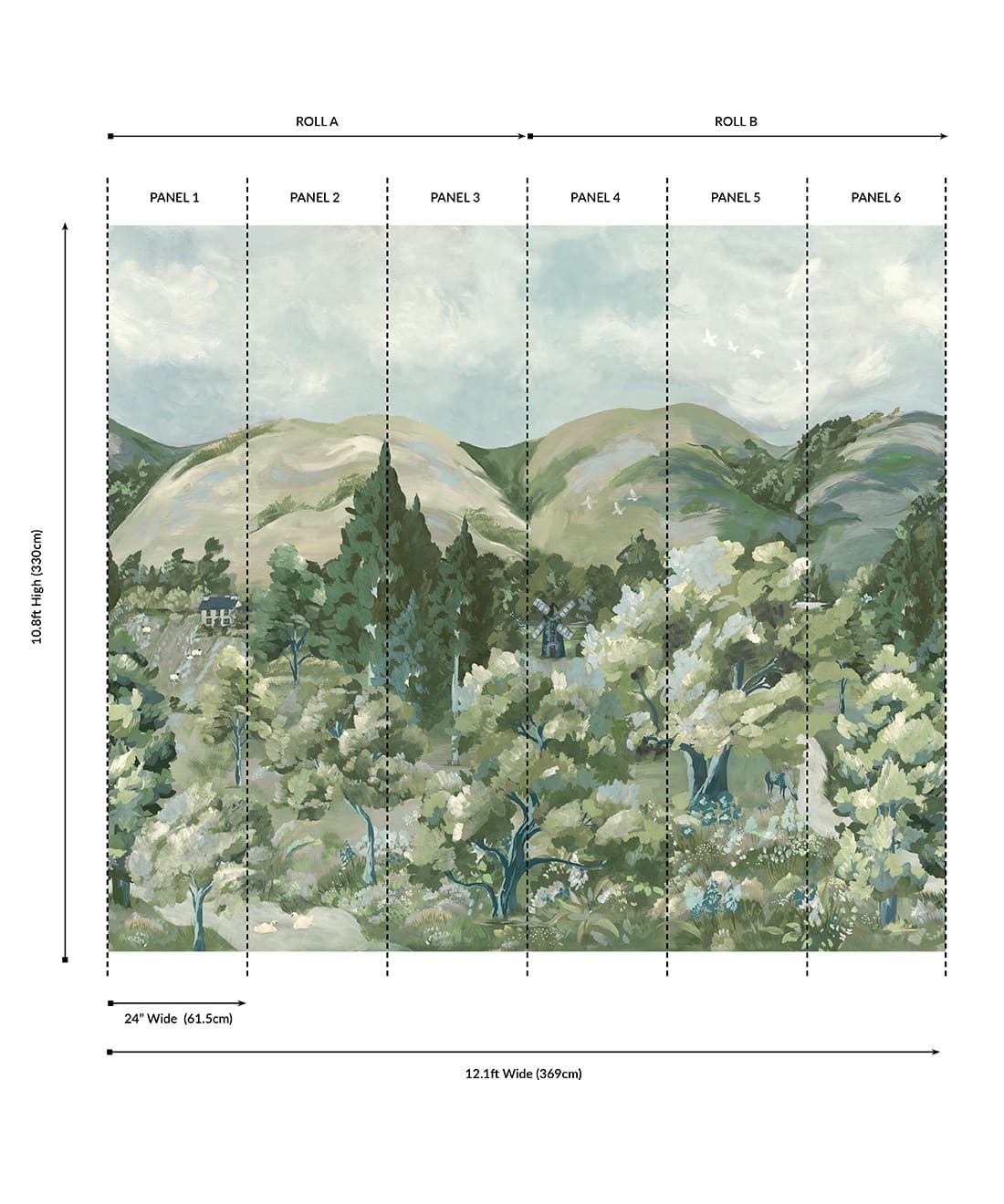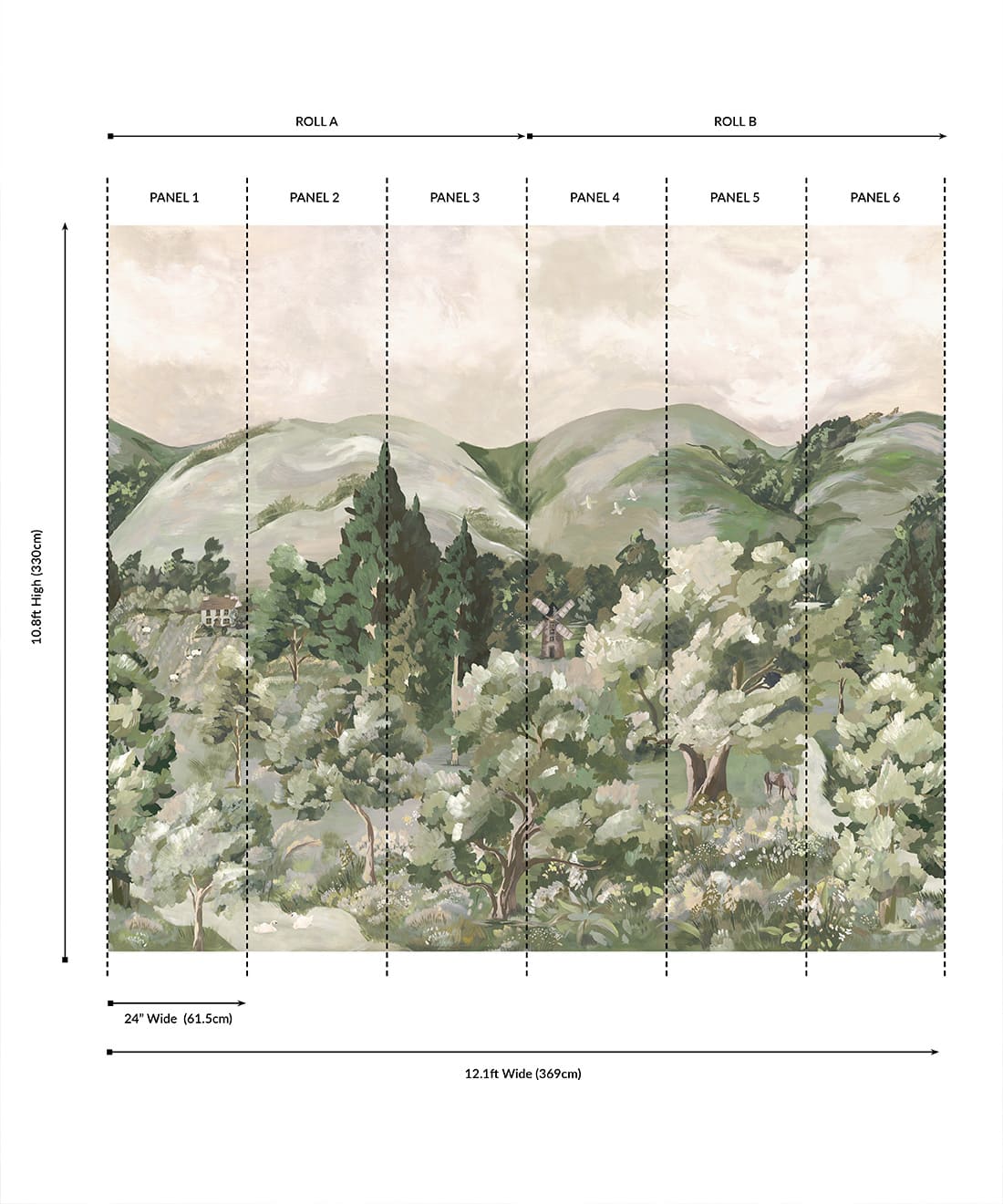 Dieses Wandbild wird als Set mit zwei Rollen geliefert (ROLL A & B). Jede Rolle enthält 3 Tafeln. Das horizontale Muster wiederholt sich alle 2 Bahnen. Bringen Sie die gesamte ROLL A an, gefolgt von der gesamten ROLL B.