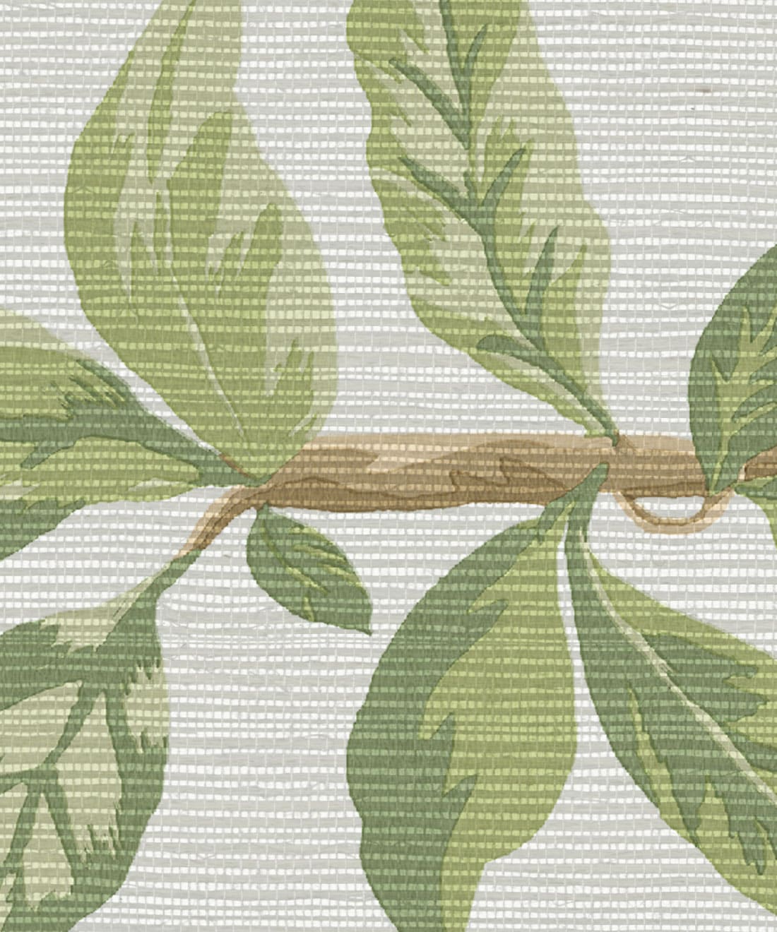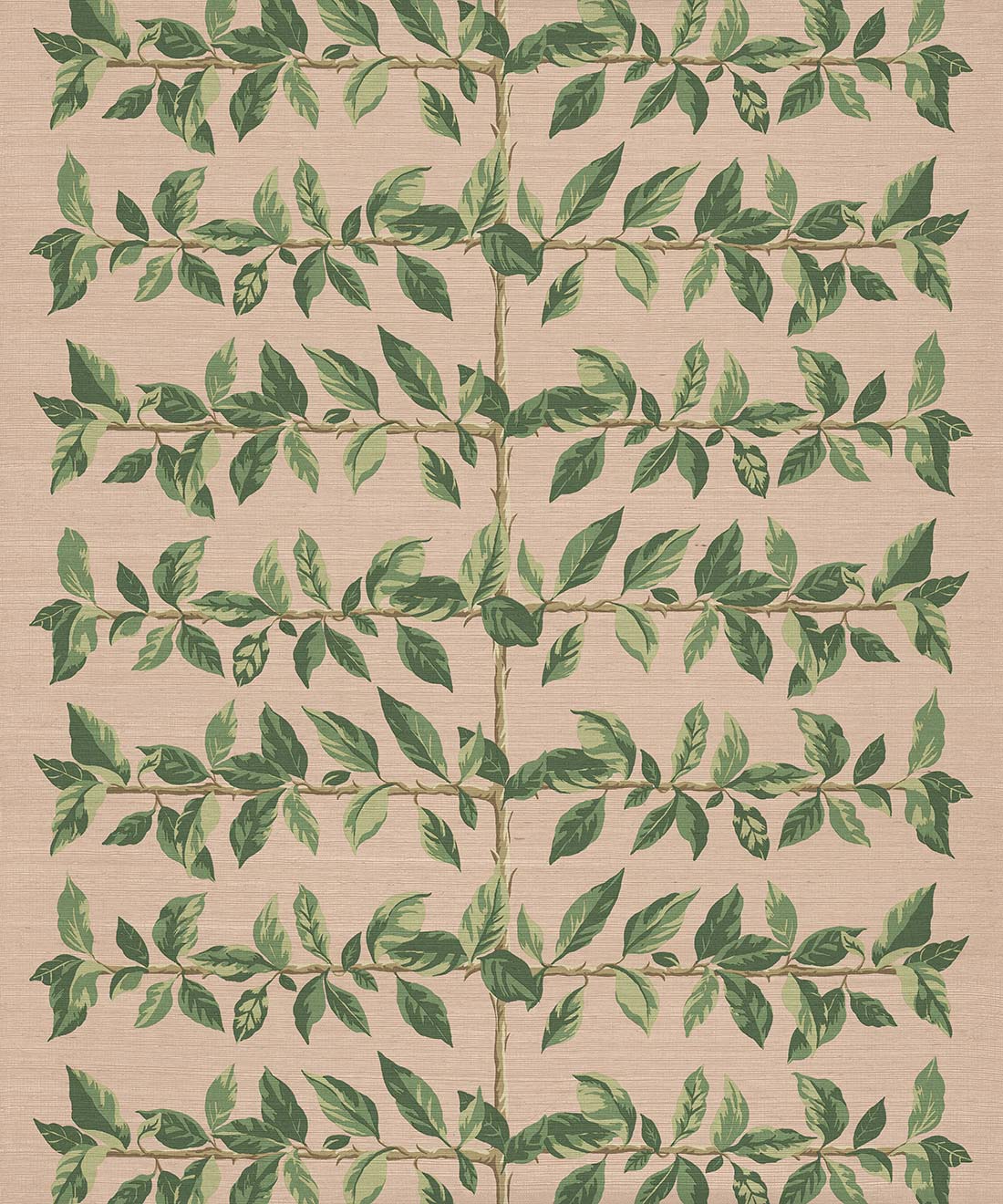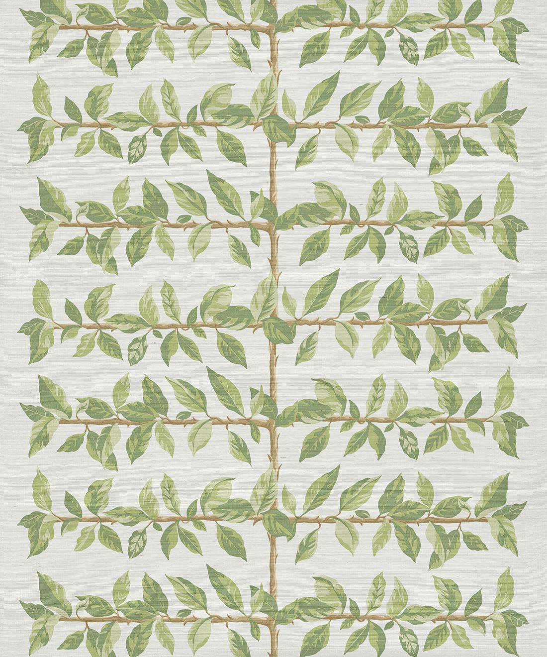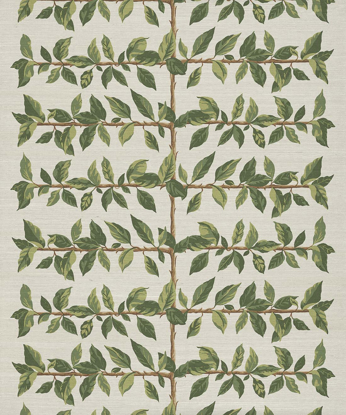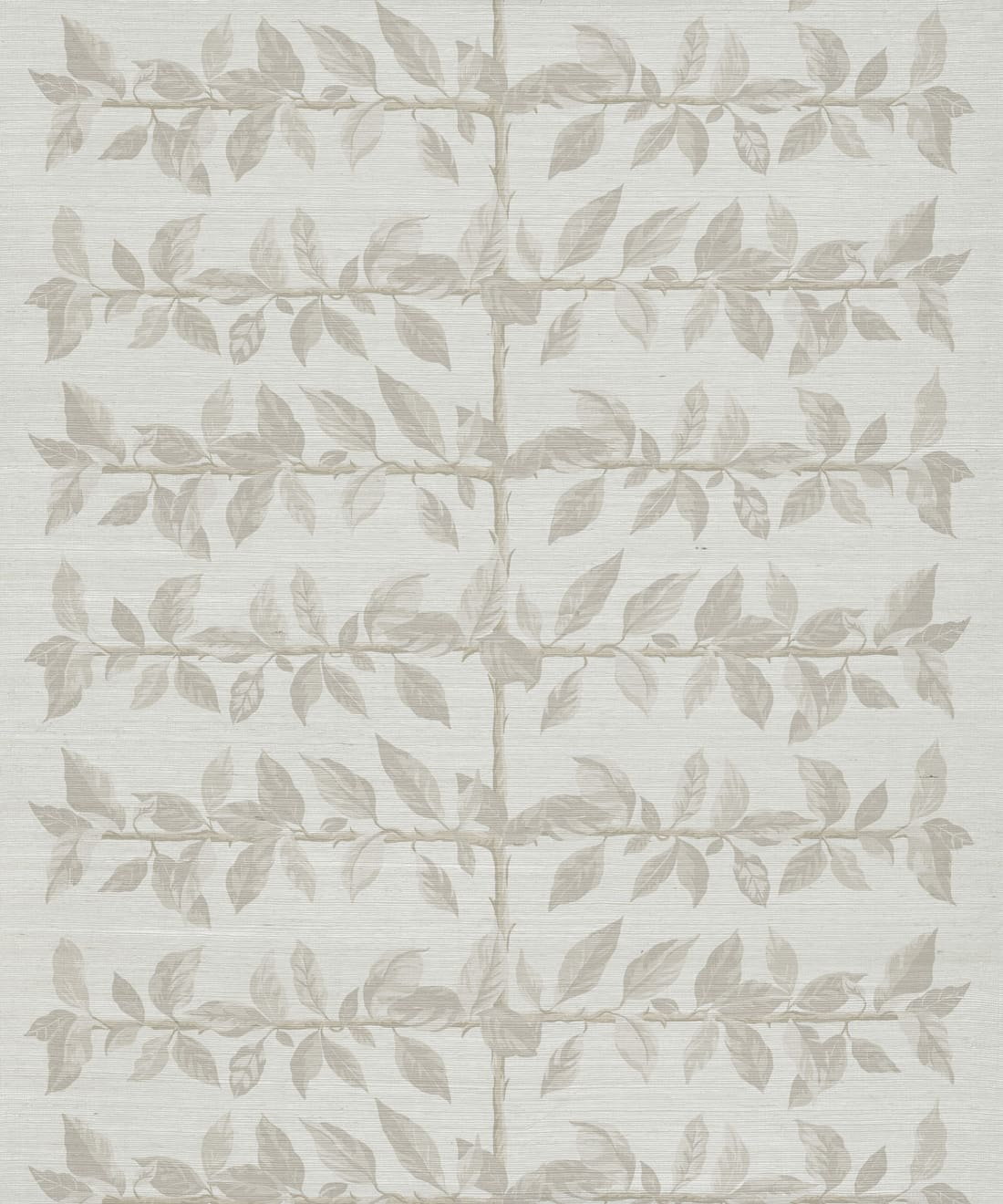Die Tapete „Pergola Grasscloth“ ist eine scale Tapete scale , die von der rankenden greenery Gartenspalieren und Pergolen inspiriert ist. Blätter und Stiele erheben sich vertikal durch das Design und bilden ein Muster, das die Struktur von Gartenkonstruktionen widerspiegelt.