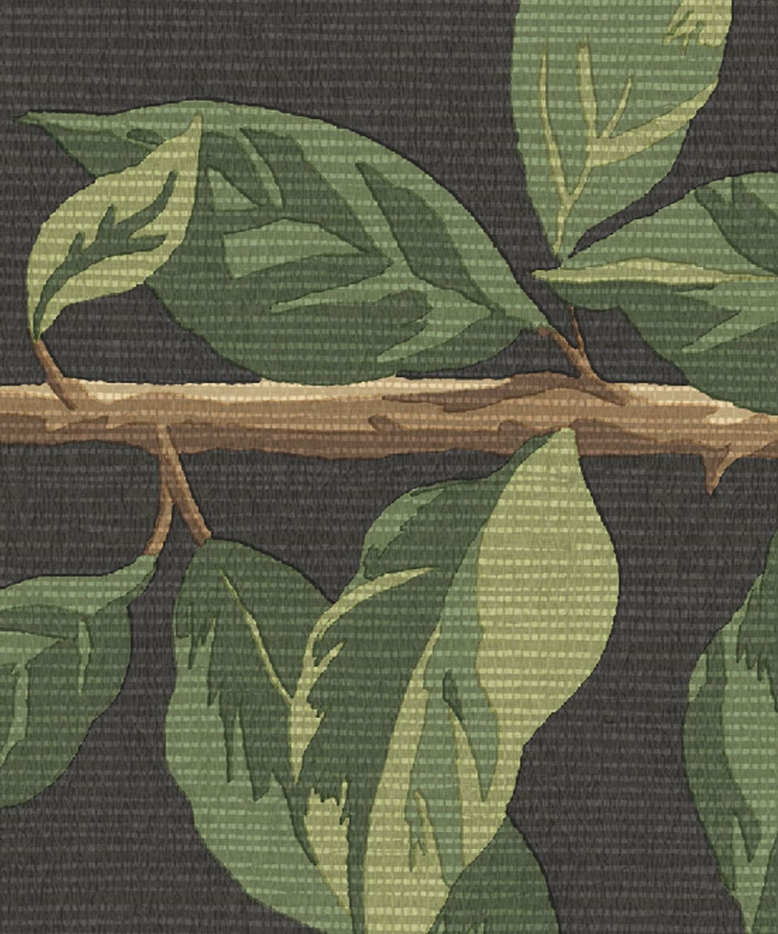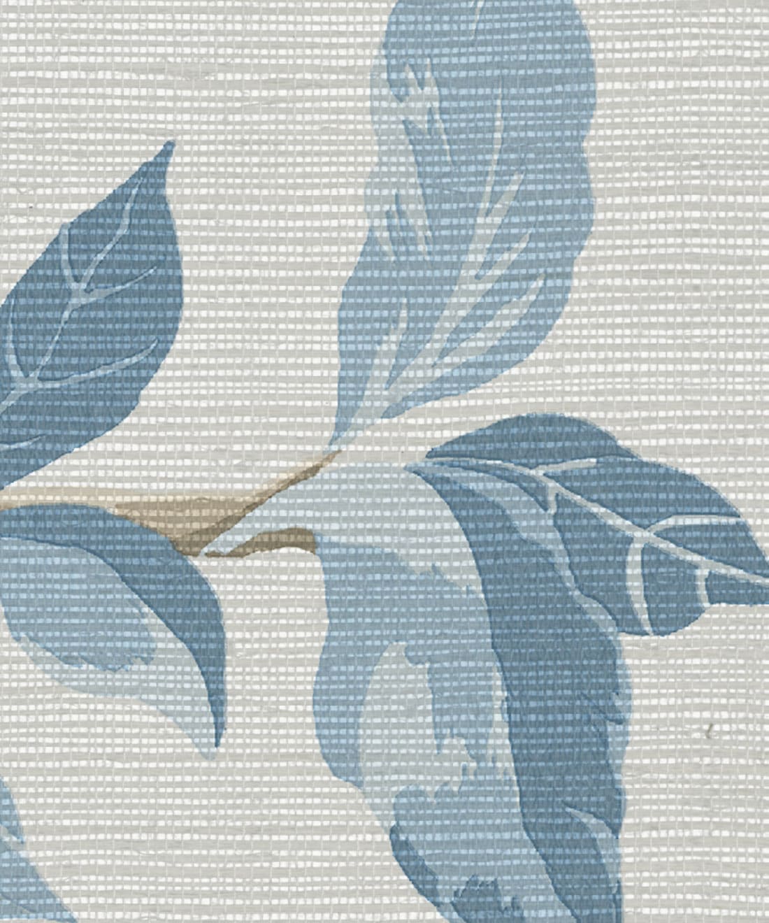 Das Muster, das in einem flächigen, dekorativen Stil gehalten ist, der an handwerklichen Siebdruck erinnert, offenbart nach und nach seine Streifen, während es sich über die Wand wiederholt. Durch den Druck auf natural erhält das Design eine zusätzliche organische Textur, die das Zusammenspiel zwischen botanischer Dynamik und architektonischem Rhythmus unterstreicht.
