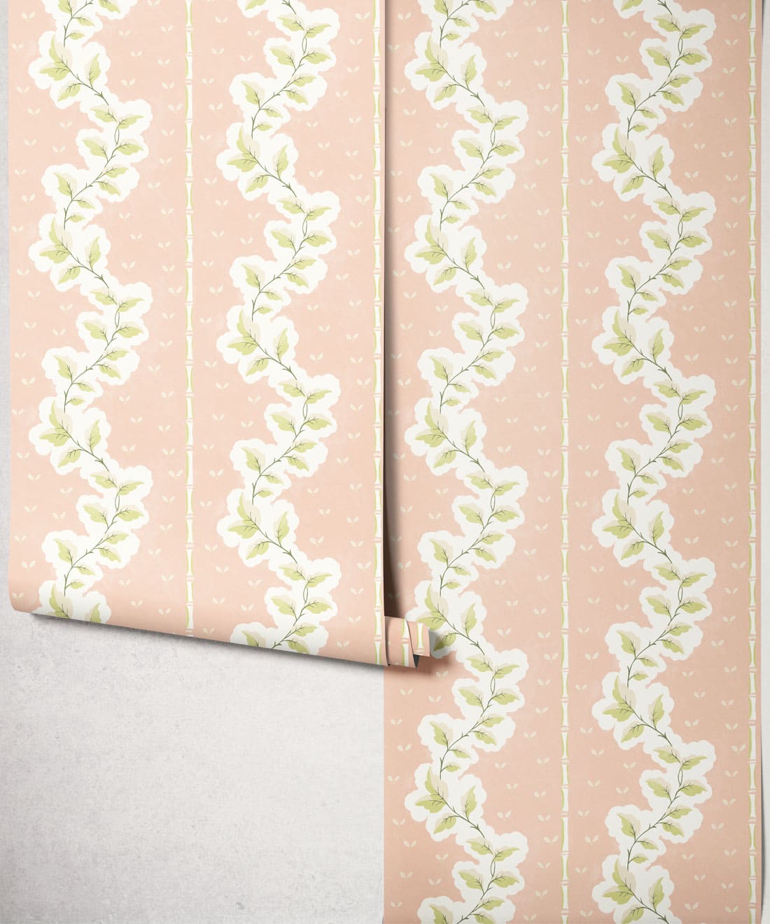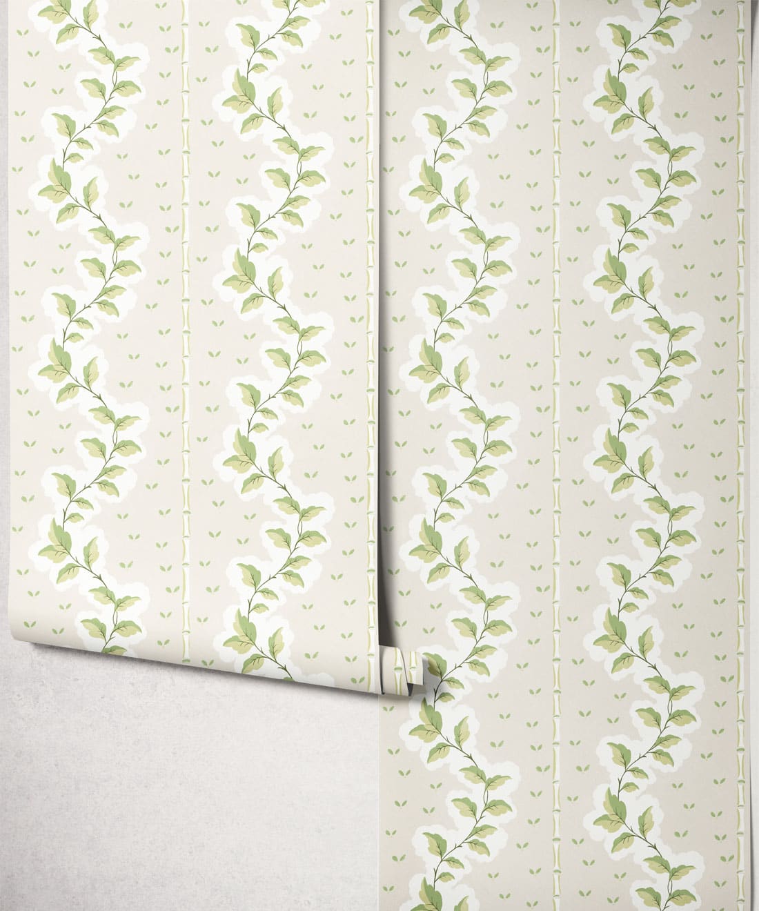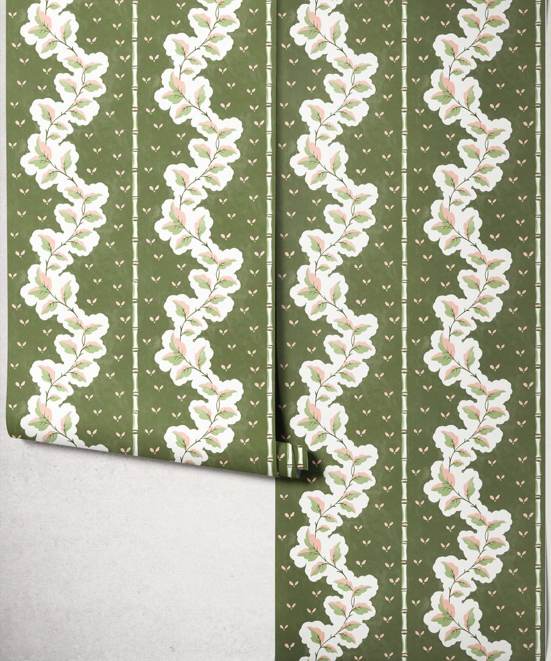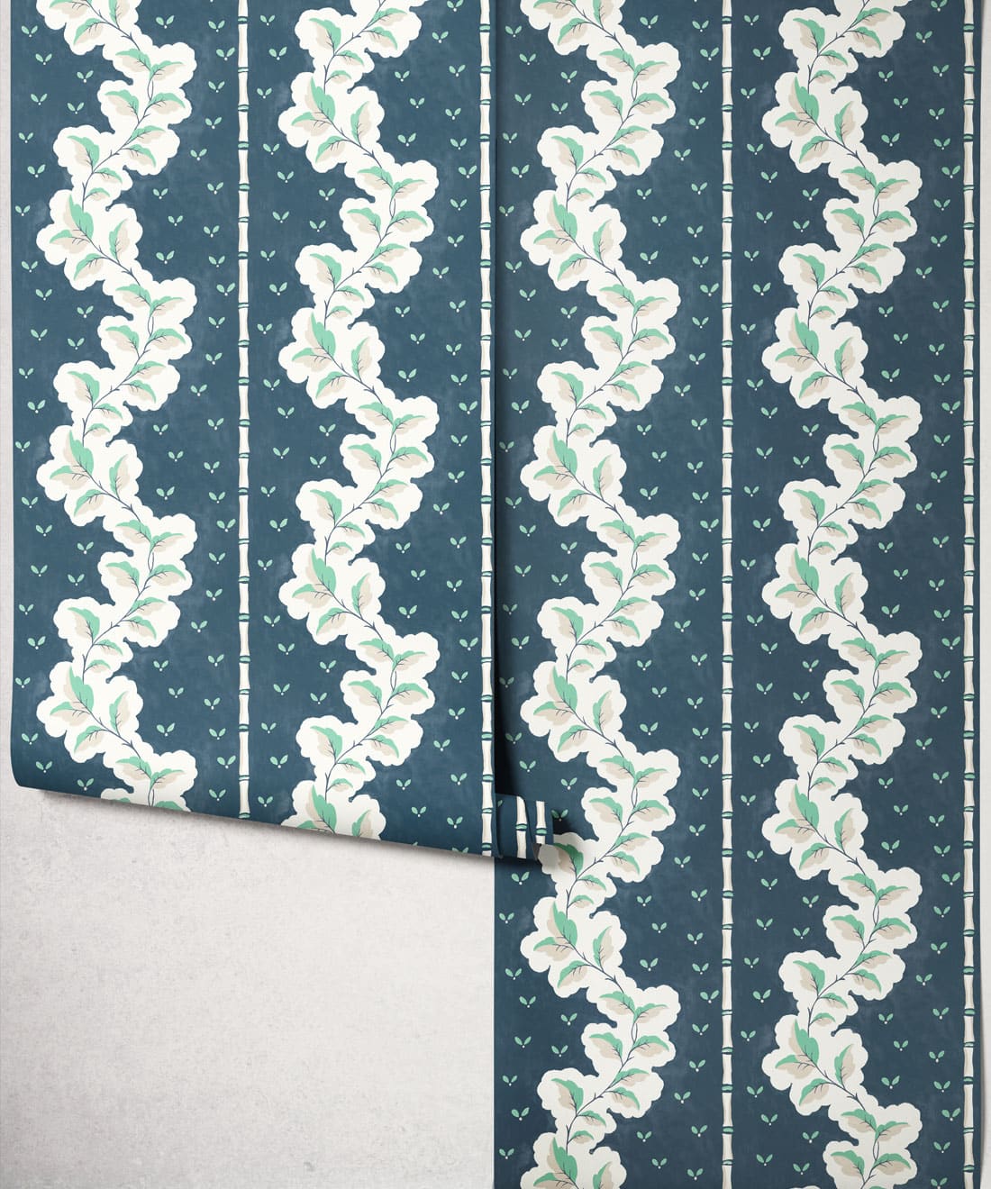 Silk ist eine handbemalte Tapete mit dekorativen Streifen, bei der Blattwerk und Muster zu einem detailreichen Design verwoben sind. Blätter und Blumenmotive ziehen sich durch die Streifen und verleihen dem Muster Bewegung und Struktur.