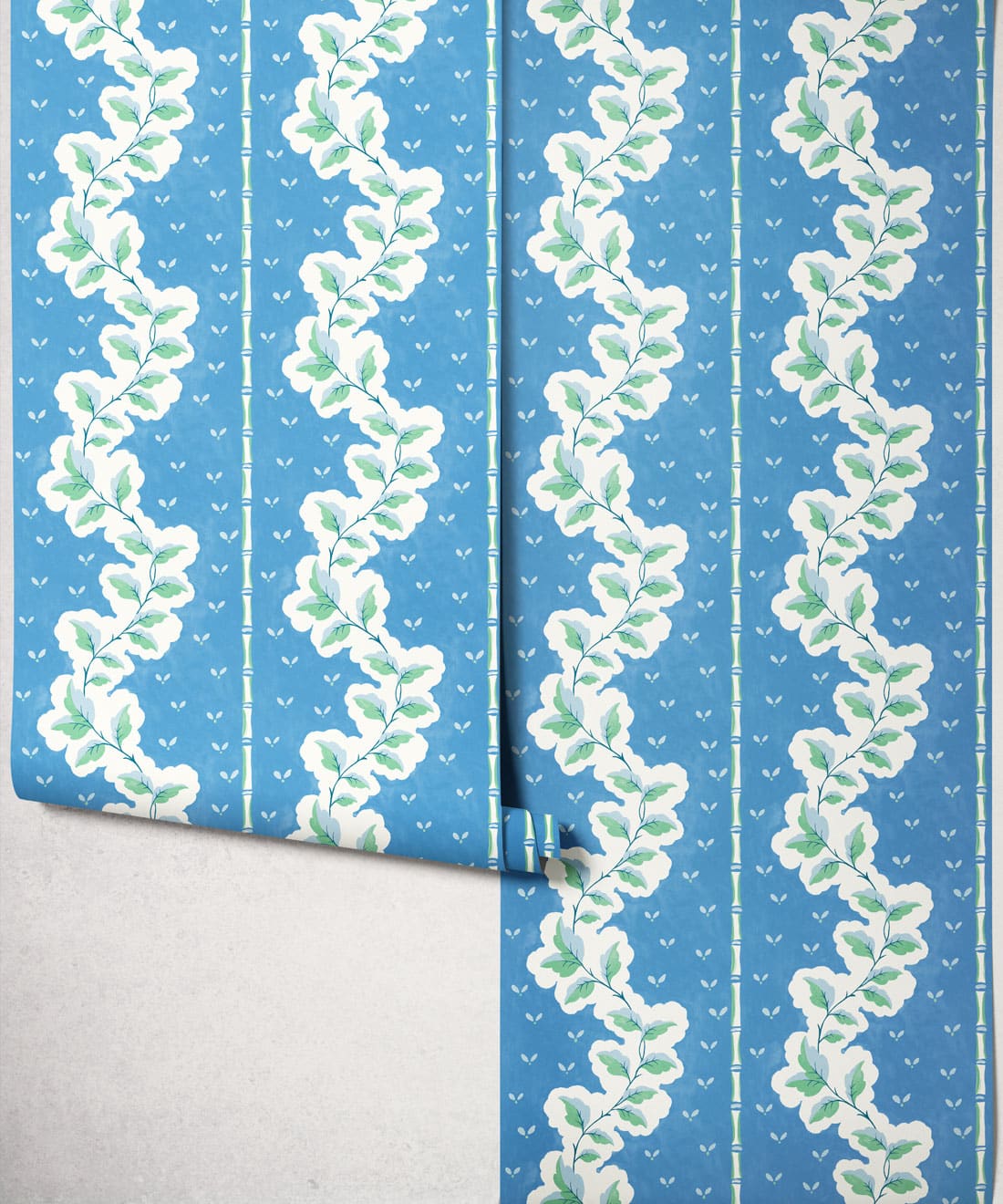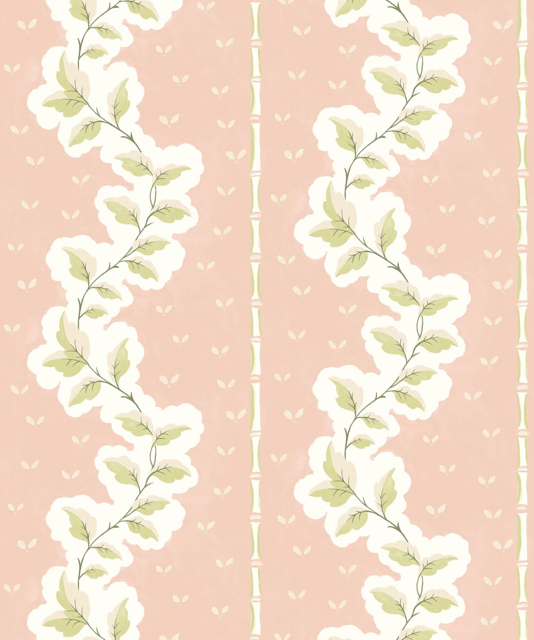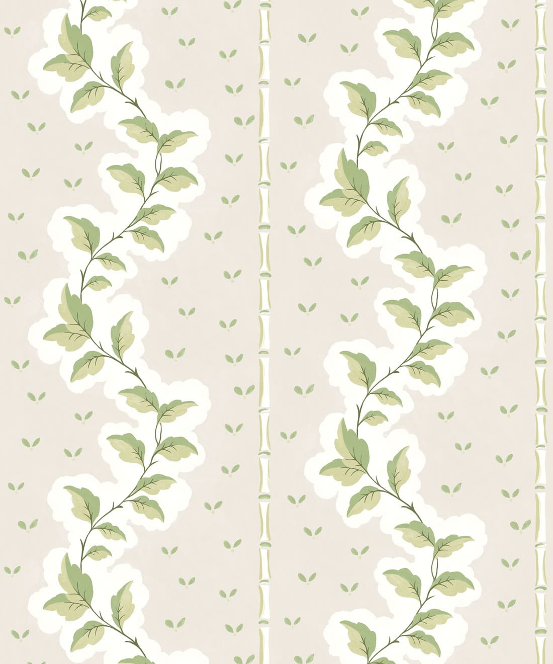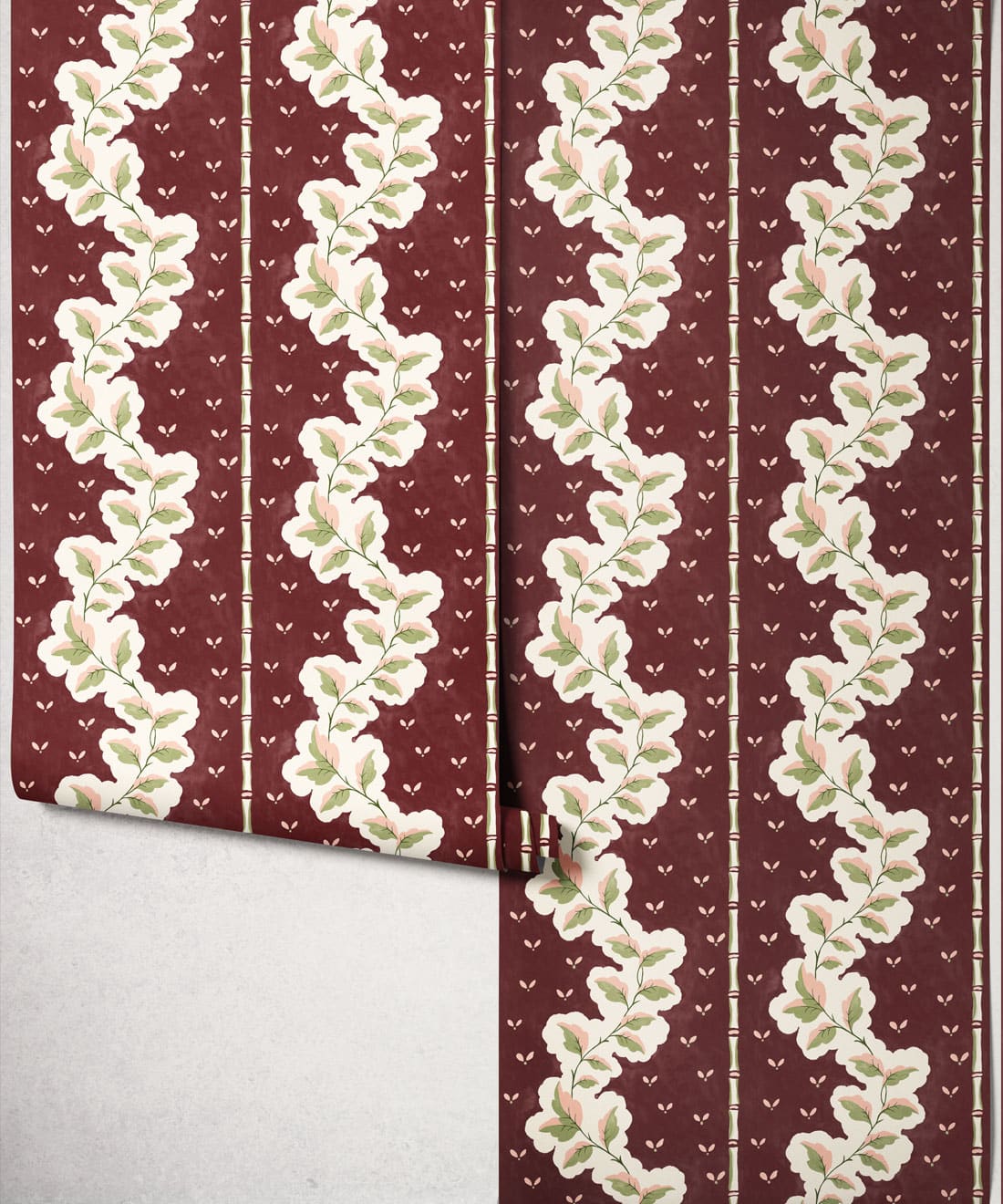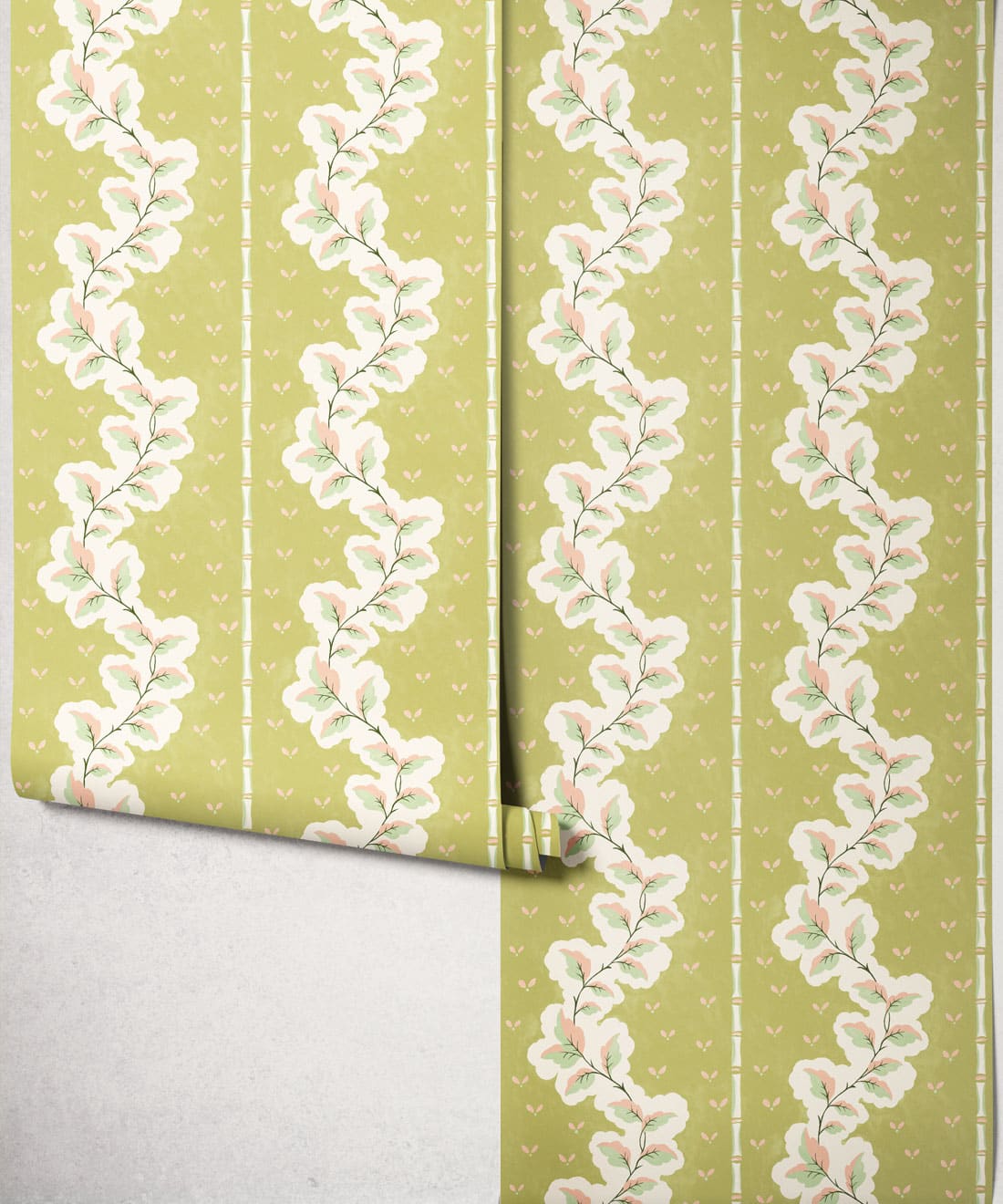 Silk ist eine handbemalte Tapete mit dekorativen Streifen, bei der Blattwerk und Muster zu einem detailreichen Design verwoben sind. Blätter und Blumenmotive ziehen sich durch die Streifen und verleihen dem Muster Bewegung und Struktur.