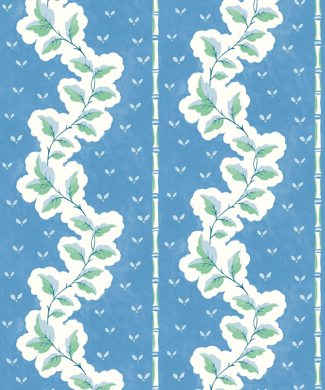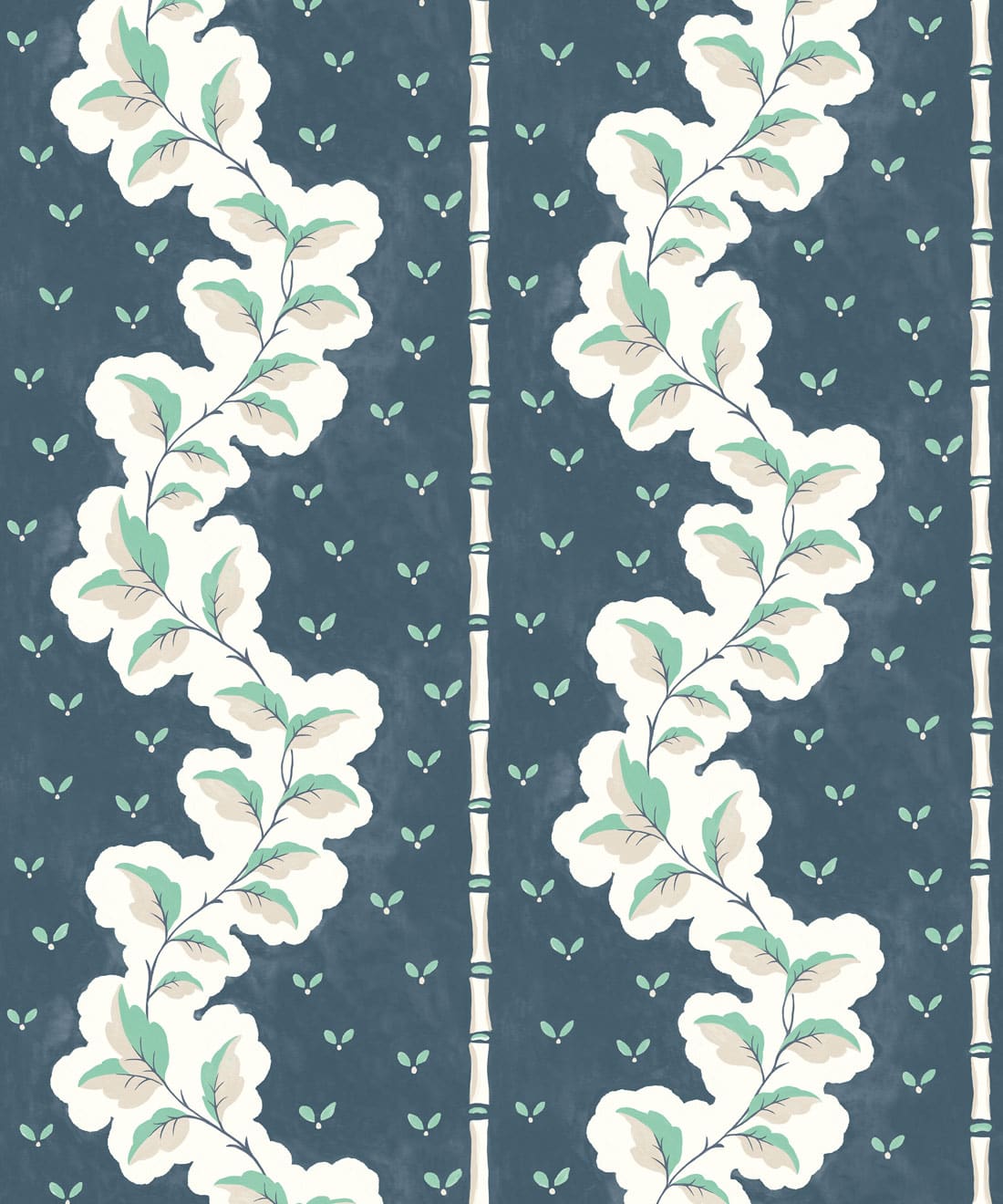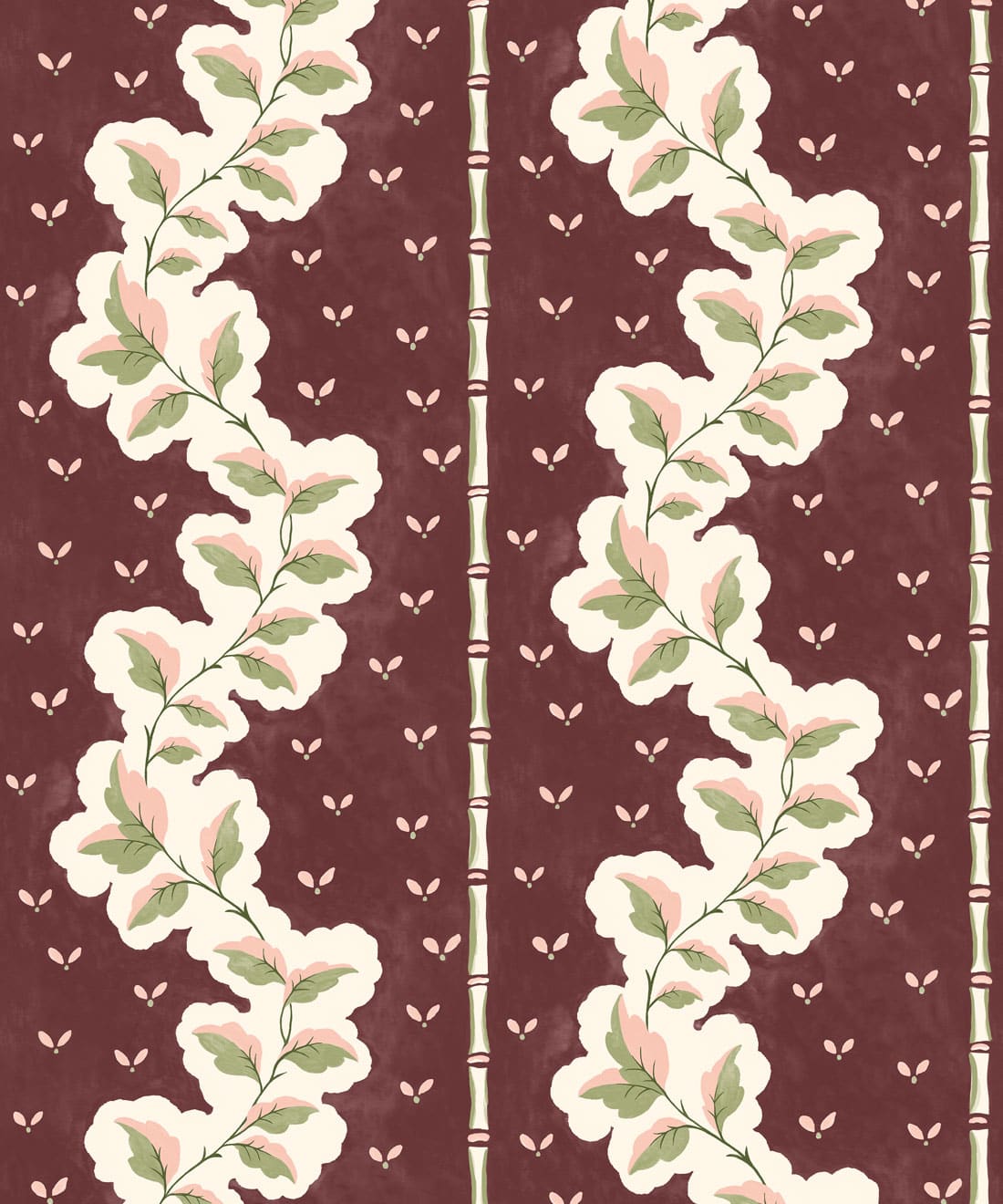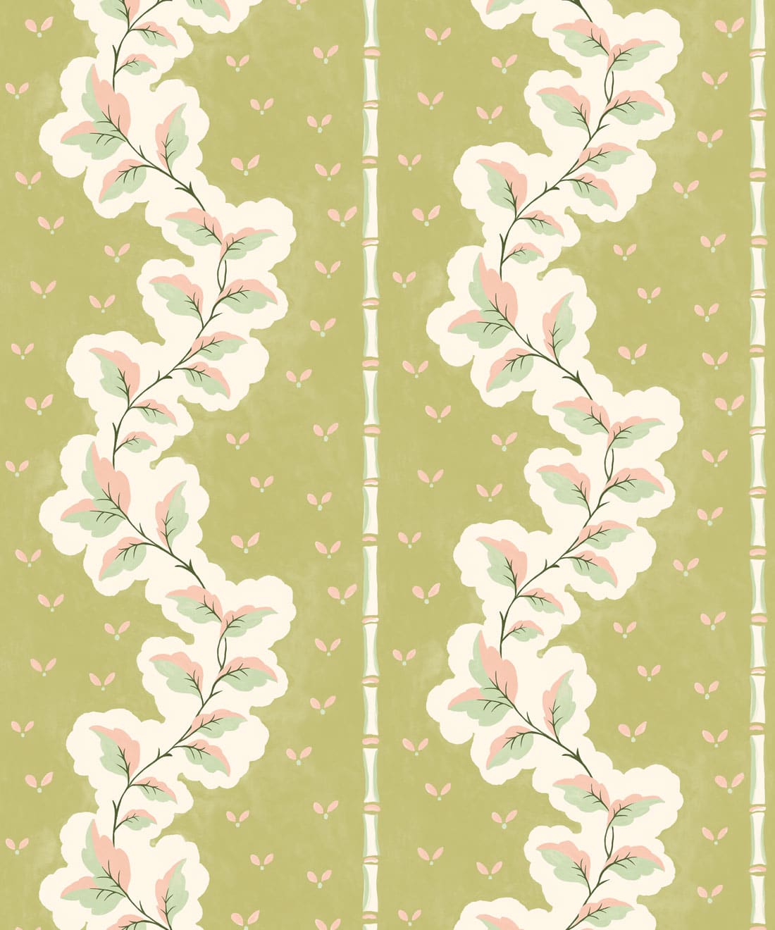 Silk ist eine handbemalte Tapete mit dekorativen Streifen, bei der Blattwerk und Muster zu einem detailreichen Design verwoben sind. Blätter und Blumenmotive ziehen sich durch die Streifen und verleihen dem Muster Bewegung und Struktur.