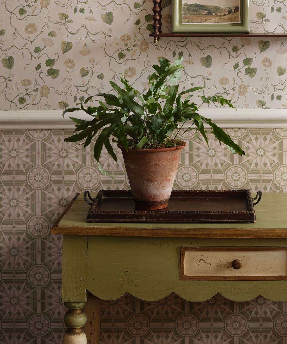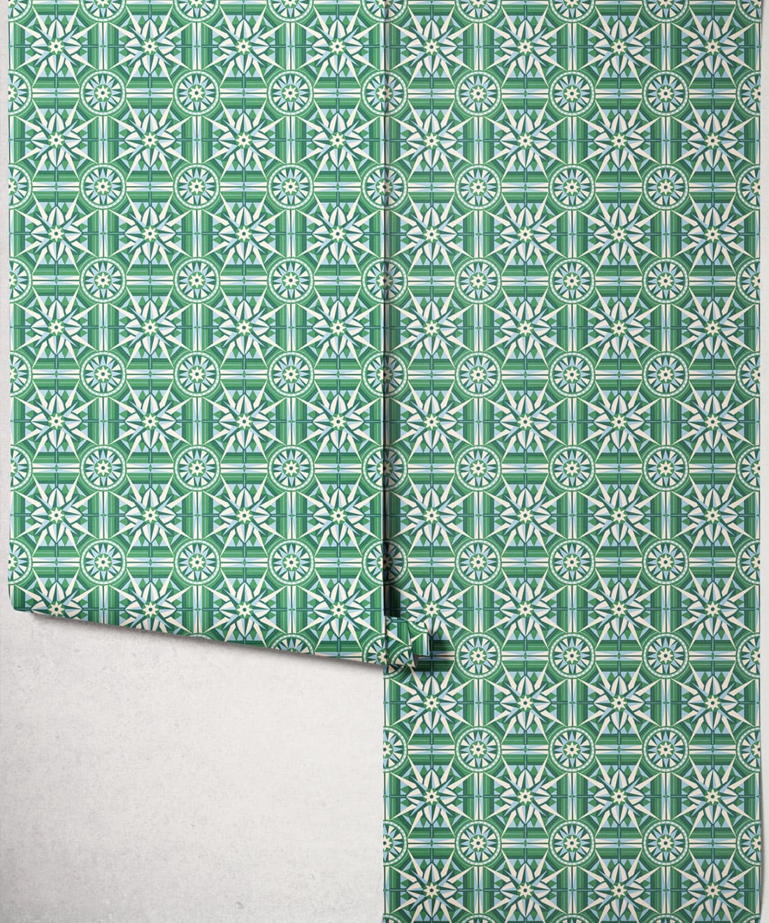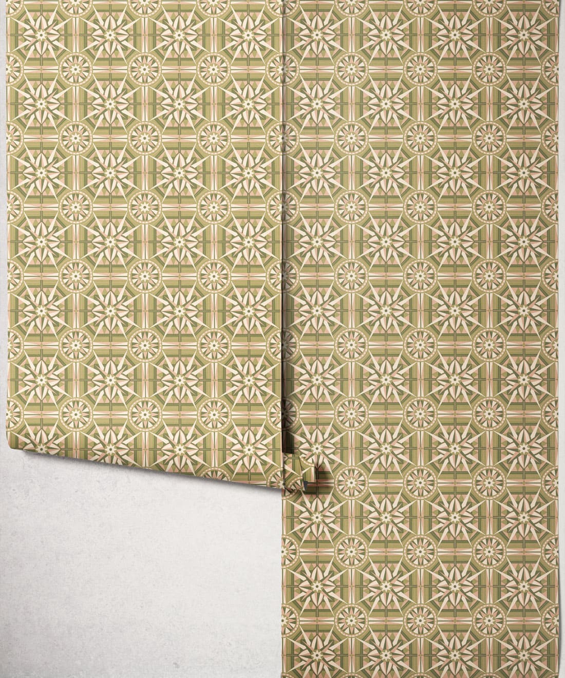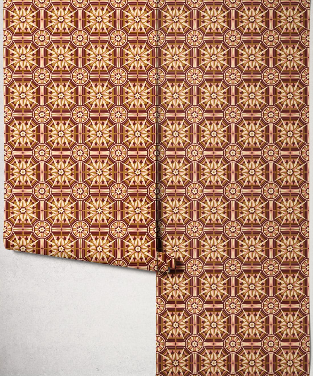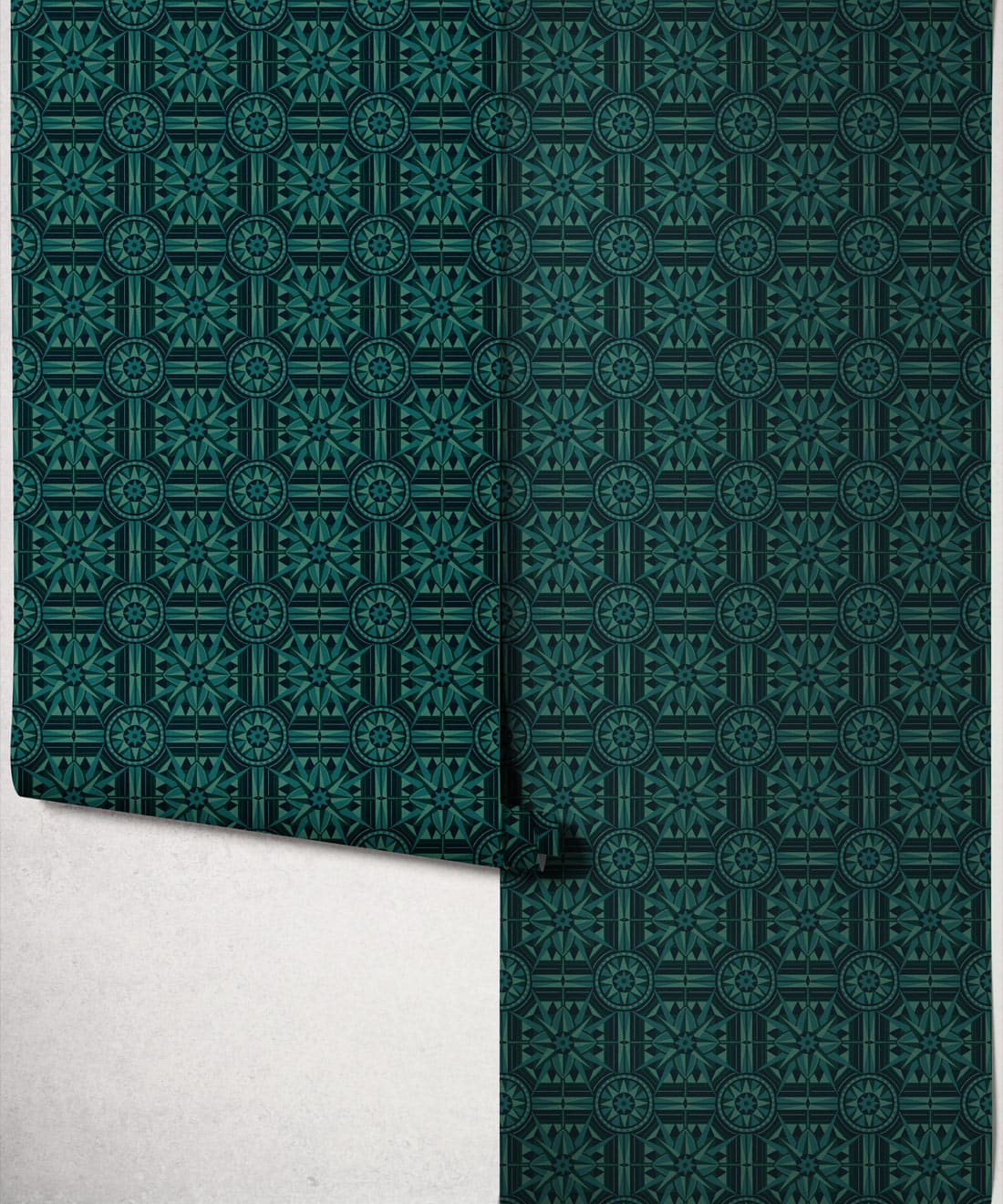 „Sundial“ ist eine geometrische Tapete, die von viktorianischen Bodenfliesen und den symmetrischen Formen traditioneller Garten-Sonnenuhren inspiriert ist. Markante Formen strahlen nach außen und bilden ein selbstbewusstes, sich wiederholendes Muster.