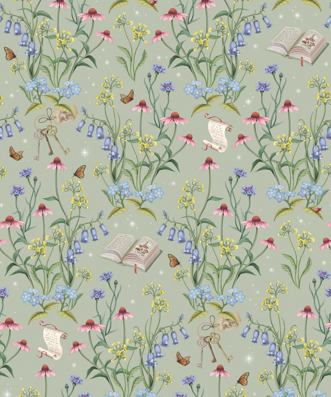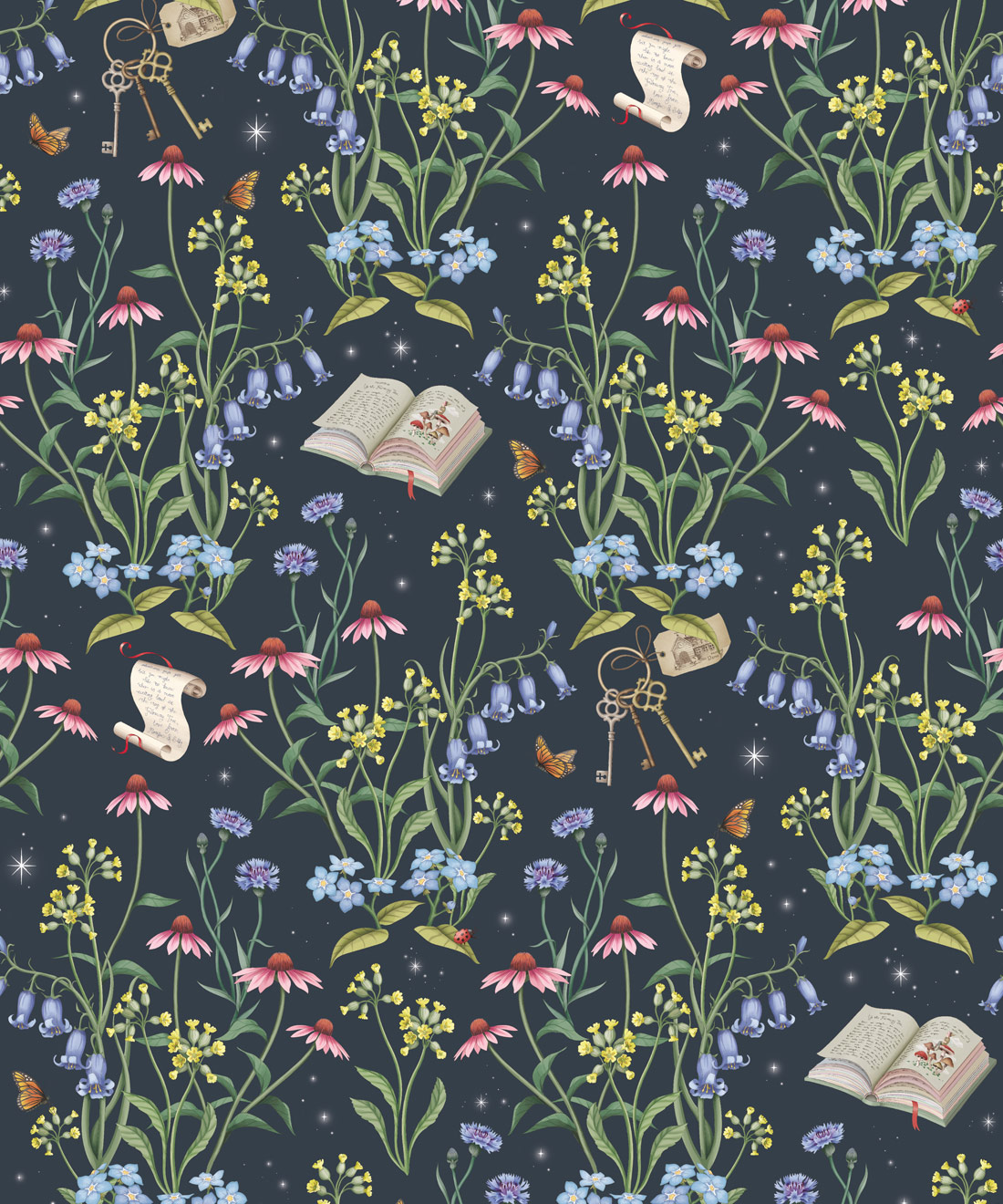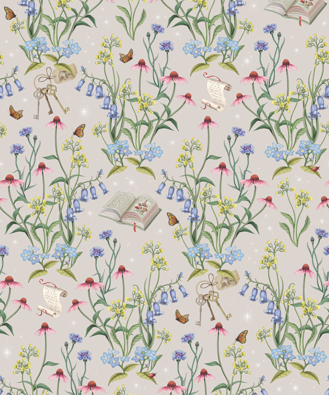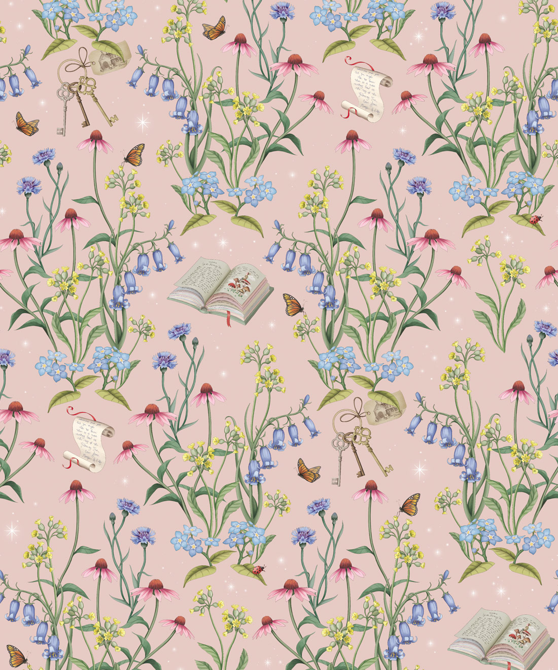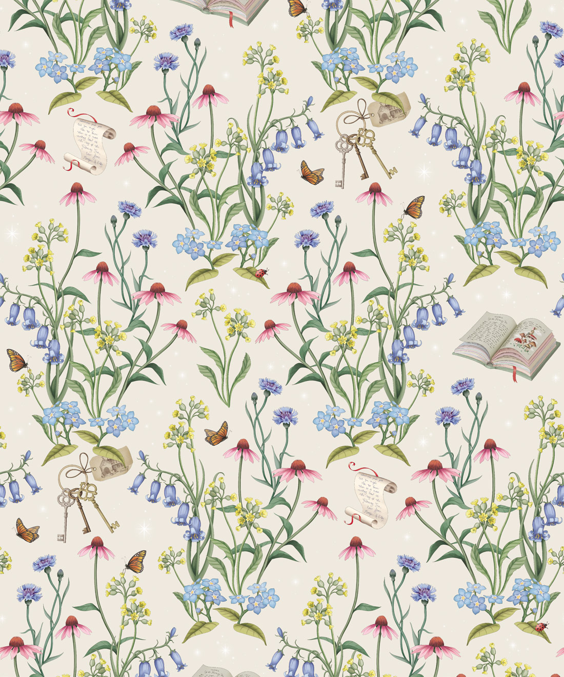 Delicati motivi floreali si intrecciano con sottili richiami alle fiabe e gentle dettagli gentle , creando uno sfondo calm fantasioso ispirato al mondo di Faraway Tree.