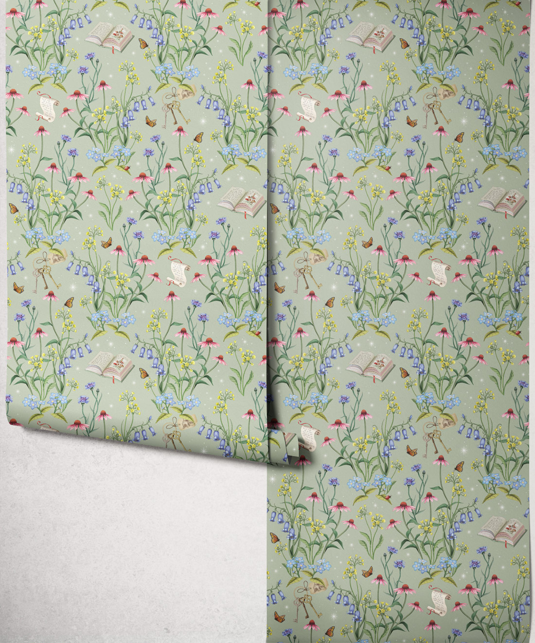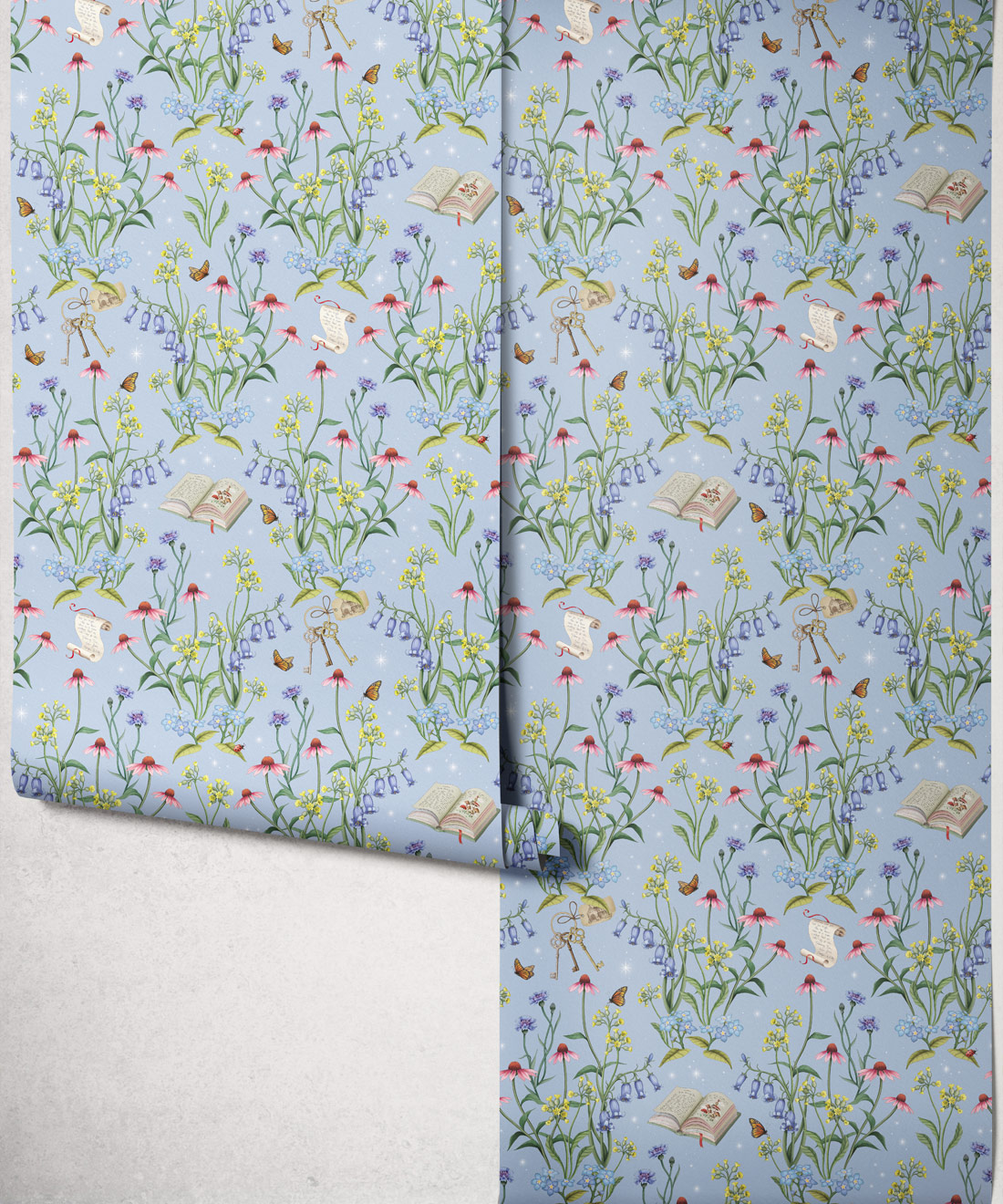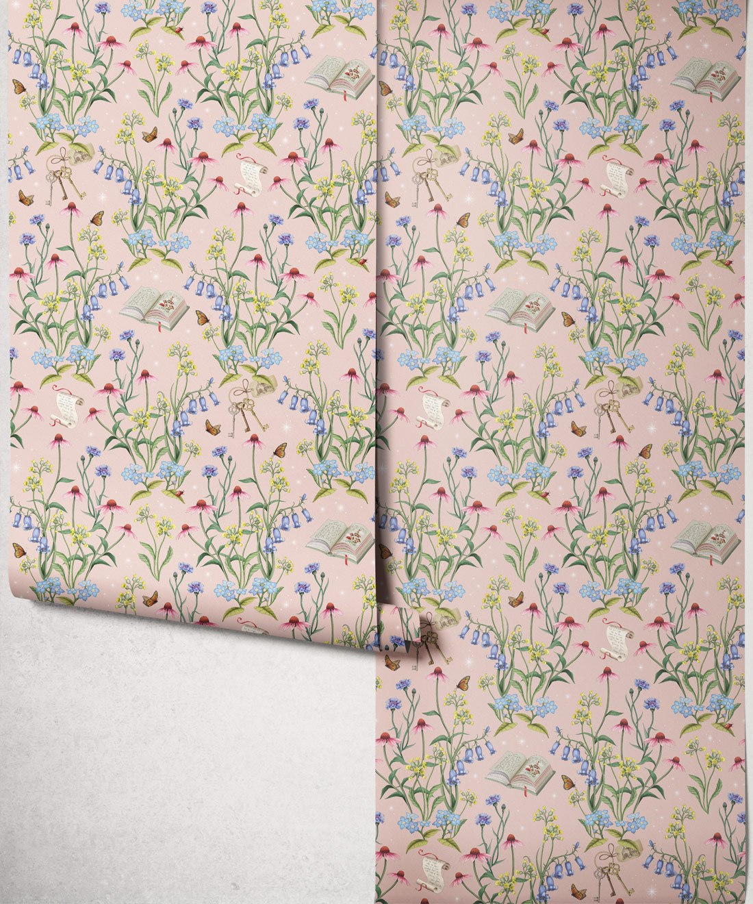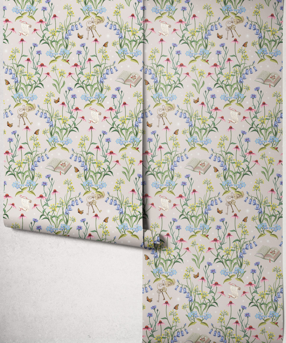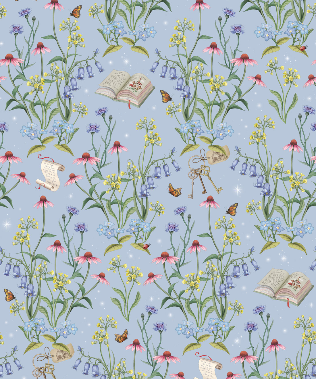 Delicati motivi floreali si intrecciano con sottili richiami alle fiabe e gentle dettagli gentle , creando uno sfondo calm fantasioso ispirato al mondo di Faraway Tree.